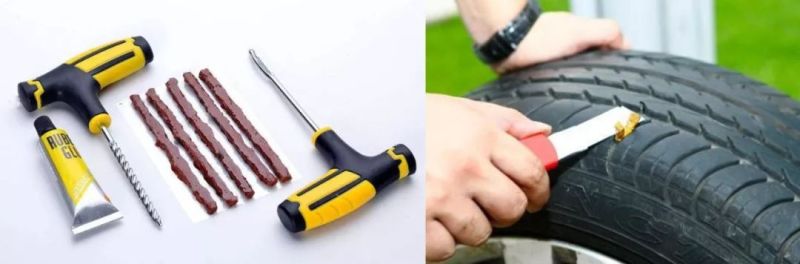 最古老的方法叫做胶条外补,轮胎都甚至不需要从轮圈上扒下来,直接把一根涂满了胶水的胶条从胎面塞进轮胎的伤口处,简单粗暴,大概率会对轮胎造成二次伤害,虽然便宜,但不推荐大家使用。