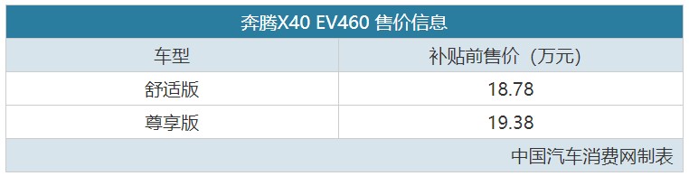 [车友头条-车友号-汽车消费Pro] [新车上市]近日,从一汽奔腾官方了解到,奔腾X40 EV460正式上市,共推出2款车型,官方指导价分别为18.78万、19.38万,相比在售的EV400起售价涨4000元,但补贴后售价还未公布。新车可看做现款奔腾X40 EV的升级版车型,NEDC综合续航里程为352km,相比X40 EV400增加了42km。