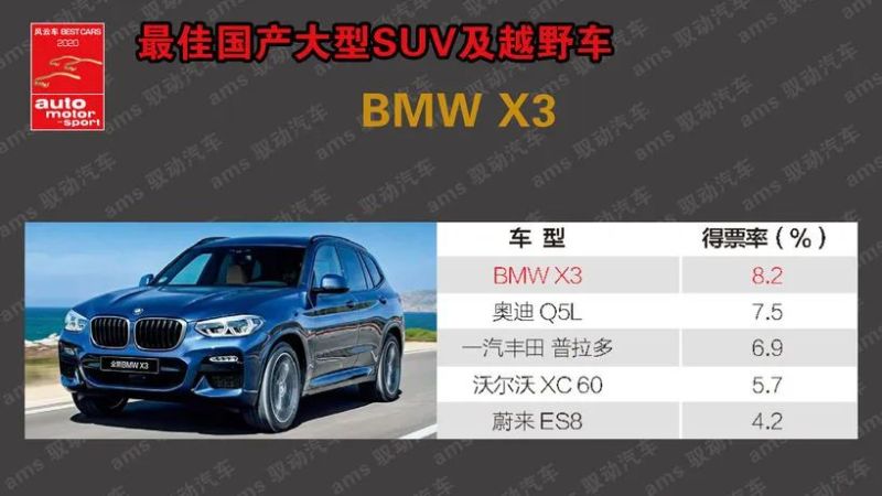 今天,我们就来聊聊 “最佳国产大型SUV及越野车” 这个奖项。相信不少人都已经在家憋太久,都在预测即将迎来所谓“报复式”消费,汽车市场同样如此。准备购车的您是否也正陷入纠结之中,不妨来看看五万多名投票者的选择吧,绝对是一本“购车宝典”。还记得在去年 “风云车2019” 评选中, BMW X3在最佳国产大型SUV及越野车、最佳大型SUV及越野车的排名分别位居第二和第三 ,当时包括我在内的不少人都觉得非常遗憾,由于当时新款X3才刚刚上市,消费者了解的还不多,显然还没到产品发力的时候。