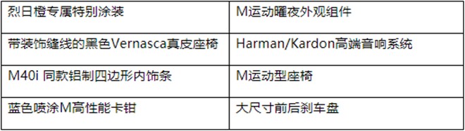 除了引人注目的外观设计,限量版的内饰尽显 现代运动风范和专属豪华。包裹性极佳的带装饰缝线的黑色Vernasca真皮M运动型座椅,充满激情而又不失沉稳。与M40i 同款的铝制四边形内饰条赋予车内极具 现代气息的运动豪华风格,融汇未来科技感与运动豪华,用精湛工艺勾勒出时尚格调。而Harman/Kardon高端音响系统则为座舱营造专属豪华听觉享受,令舒适愉悦的驾驶感受回味无穷。