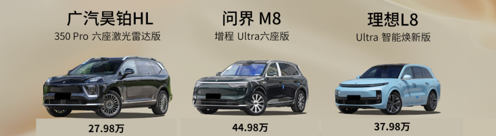 那么面对成名已久的问界M8、理想L8,后来者广汽昊铂HL增程版有没有胜算呢?今天就来摆事实讲道理,分别选择广汽昊铂HL 350 Pro六座激光雷达版(指导价27.98万 以下简称广汽昊铂HL增程版)、问界M8增程Ultra六座版(指导价44.98万 以下简称问界M8)和理想L8 Ultra智能焕新版(指导价37.98万 以下简称理想L8)进行横向对比一番。
